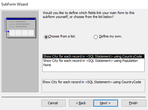 After selecting the Use existing Tables and Queries, you will now be prompted to choose the fields to use in the subform. Now make a selection for the table or query from the drop-down list.